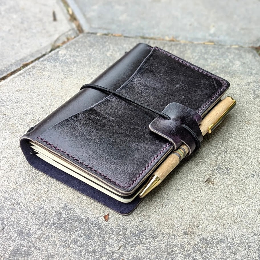 Eggplant Purple is a collection of traveller's notebook covers, made from distressed purple leather that's rich in character. Firm, durable, and built to last, this leather will develop a distinctive patina as it ages. Bold in colour, deep in personality, perfect for ideas as unique as you are.